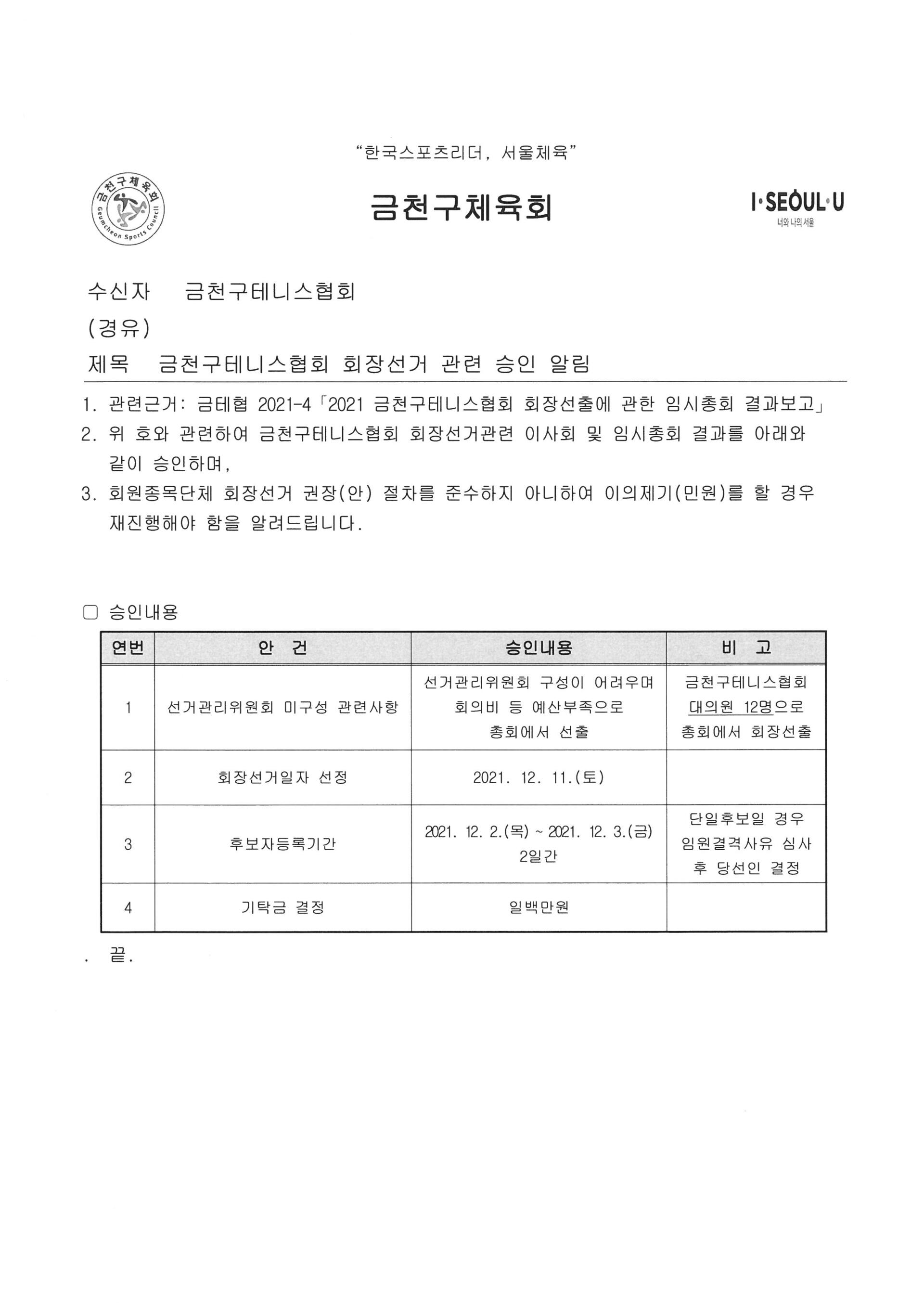 금천구테니스협회 회장선거 관련 승인 알림