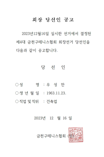 제4대 금천구테니스협회장 선거 당선인 공고