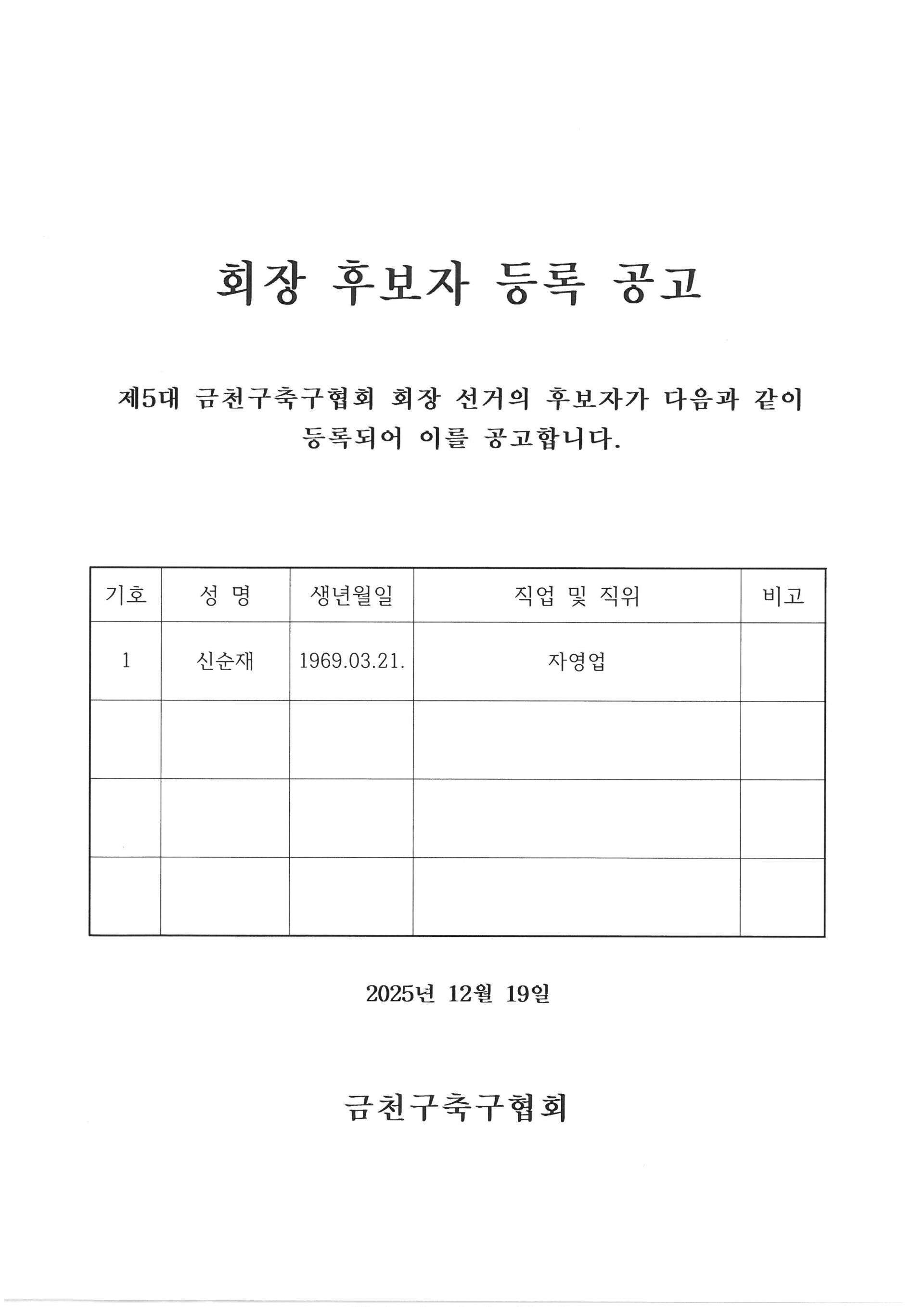 제5대 금천구축구협회 회장 후보자 등록 공고