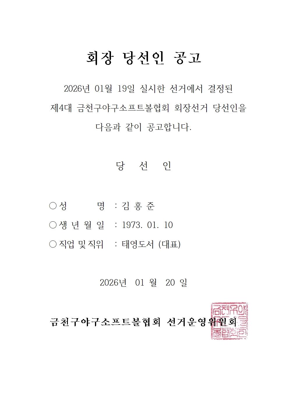 제4대 금천구야구소프트볼협회 회장 선거 당선인 공고